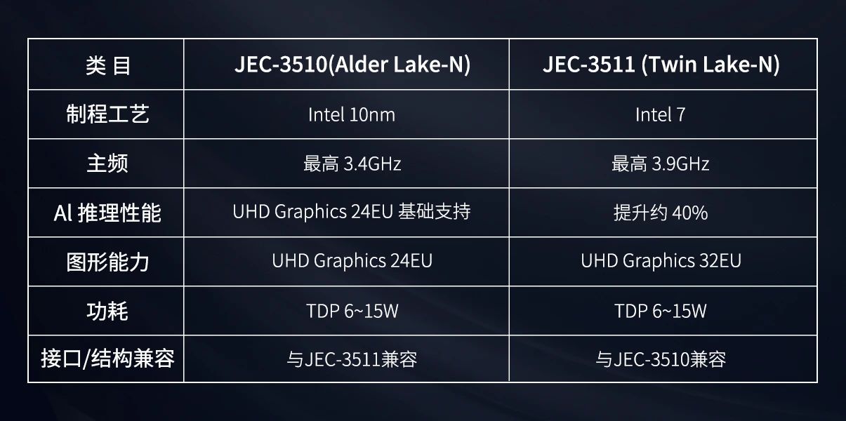 相較前代主力機(jī)型JEC-3510,JEC-3511支持PIN對(duì)PIN兼容,實(shí)現(xiàn)零成本替換升級(jí),助力用戶在工業(yè)自動(dòng)化、邊緣AI、工業(yè)網(wǎng)關(guān)等應(yīng)用場景中輕松完成性能躍遷。