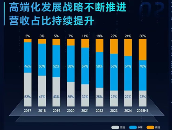 更值得關(guān)注的是,高端產(chǎn)品在公司營收占比中的快速提升。2025年上半年,公司高端產(chǎn)品營收占比已提升至30%,而在2024年同期,這一數(shù)字還僅為22%。這意味著在短短一年時間內(nèi),公司高端產(chǎn)品占比提升了8個百分點(diǎn),充分證明了公司產(chǎn)品結(jié)構(gòu)優(yōu)化戰(zhàn)略正在加速推進(jìn)。