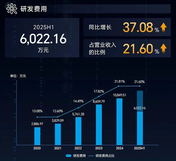 從研發(fā)投入的絕對金額來看,2025年上半年,公司研發(fā)費(fèi)用投入高達(dá)6022.16萬元,同比增長37.08%,這一增速明顯高于營收增速,顯示出公司對技術(shù)創(chuàng)新的高度重視。