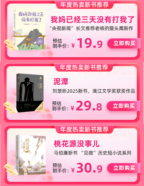 而除了學(xué)習(xí)充電,若想在工作之余用書籍放松心情、卸下疲憊,這幾本兼具趣味與治愈感的書也很適合:作為“央視新聞”長文推薦的老楊貓頭鷹新作,《我媽已經(jīng)三天沒有打我了》用詼諧文字幫你回憶童年趣事,預(yù)估到手價19.9元;《泥潭》是劉楚昕漓江文學(xué)獎獲獎作品,29.8元即可獲得你的精神療愈旅程;《桃花源沒事兒》是馬伯庸“見微”歷史短小說系列之一,從歷史故事中帶你短暫脫離忙碌節(jié)奏,預(yù)估到手價30.9元。這三本各有特色,在工作間隙為你帶來別樣的閱讀體驗。