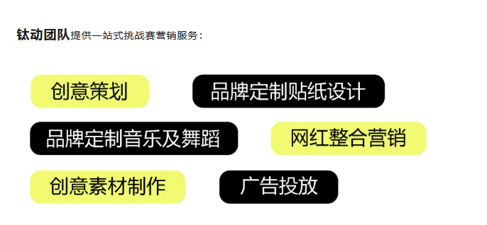 鈦動(dòng)科技基于對(duì)TikTok平臺(tái)生態(tài)的深度理解,構(gòu)建了涵蓋創(chuàng)意策劃、資源整合與效果優(yōu)化的全鏈路挑戰(zhàn)賽解決方案。該體系以品牌定制創(chuàng)意為核心,通過(guò)專業(yè)貼紙?jiān)O(shè)計(jì)、專屬音樂(lè)制作與標(biāo)志性舞蹈編排,打造具有高度辨識(shí)度的品牌內(nèi)容資產(chǎn),確保品牌元素與挑戰(zhàn)賽玩法的深度融合。