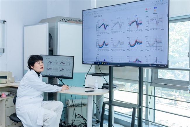 (圖注:評審團(tuán)成員上海中醫(yī)藥大學(xué)附屬岳陽中西醫(yī)結(jié)合醫(yī)院主任醫(yī)師&教授姜淑云比對外骨骼運(yùn)動(dòng)數(shù)據(jù))