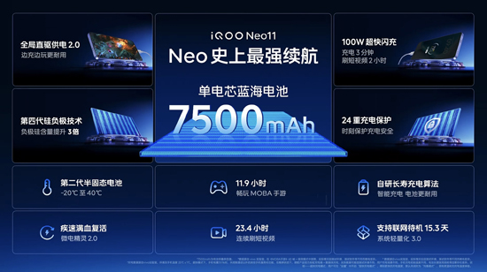 iQOO Neo11內(nèi)置7500mAh 超薄藍(lán)海電池,采用第二代半固態(tài)與第四代硅負(fù)極技術(shù),能量密度達(dá) 849Wh/L,-20℃極寒環(huán)境仍能穩(wěn)定供電。搭配 100W 超快閃充,實(shí)現(xiàn) “充電 3 分鐘,抖音 2 小時” 的回血速度,全局直驅(qū)供電 2.0 技術(shù)可智能溫控,邊充邊玩不燙手。​