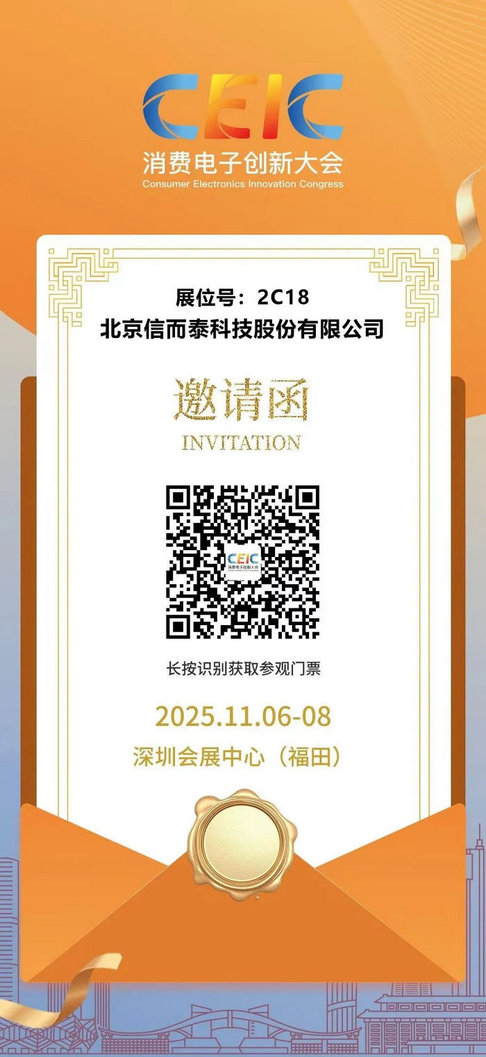 北京信而泰科技股份有限公司誠摯邀請您蒞臨 2025消費(fèi)電子創(chuàng)新大會(huì)(CEIC 2025) ,與我們共同探索消費(fèi)電子領(lǐng)域的前沿技術(shù)與創(chuàng)新應(yīng)用。本次大會(huì)將于 2025年11月6日至8日 在 深圳會(huì)展中心(福田)2號館 隆重舉行,我司展位號為 2C18,期待與您相見!