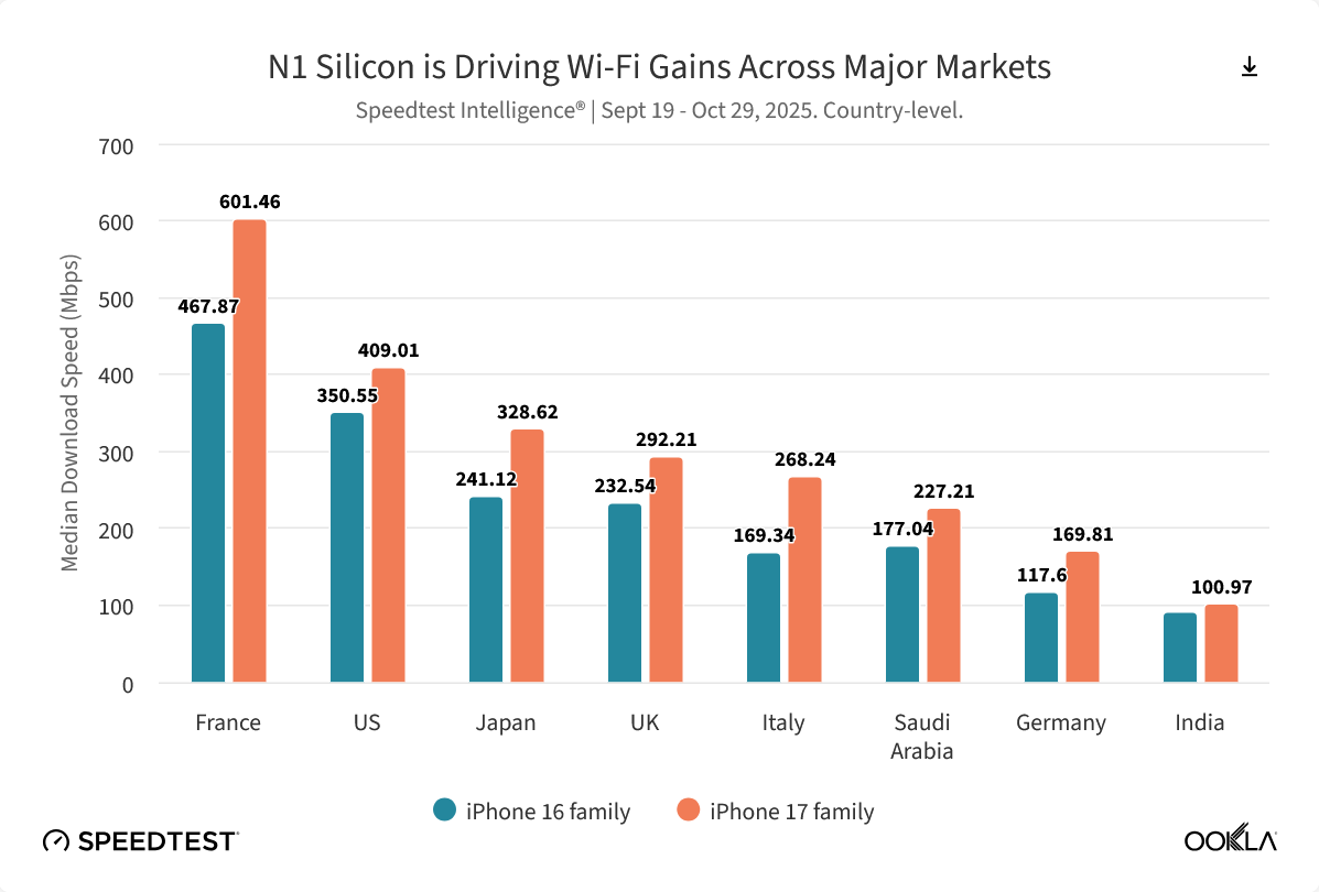 11 月 18 日消息,測速機(jī)構(gòu) Ookla 昨日(11 月 17 日)發(fā)布最新《Speedtest Intelligence》報告,指出 2025 年成為 Wi-Fi 技術(shù)競爭的關(guān)鍵年份,蘋果公司正式在 iPhone 17 系列中推出其首款自研無線網(wǎng)絡(luò)芯片 N1,相比較 iPhone 16 系列,全球上傳和下載中位數(shù)增幅均達(dá)到 40%。