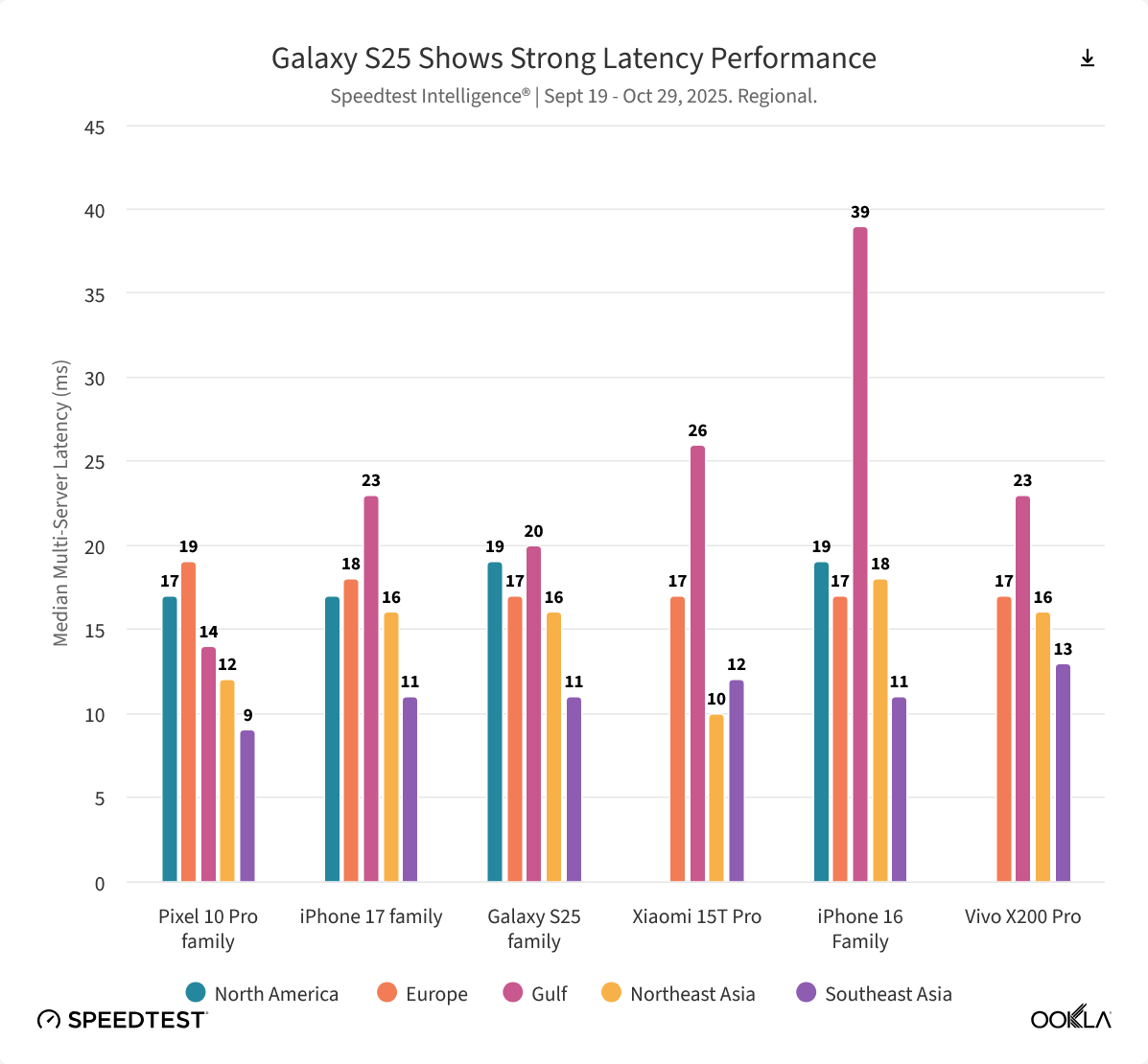 三星 Galaxy S25 系列則在延遲穩(wěn)定性上表現(xiàn)出色,在北美、歐洲等多個地區(qū)創(chuàng)下最低延遲記錄。