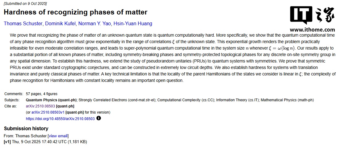 11 月 1 日消息,量子計(jì)算通常被視為破解復(fù)雜問(wèn)題的關(guān)鍵,但加州理工學(xué)院(Caltech)研究人員發(fā)現(xiàn),即便是最先進(jìn)的量子計(jì)算機(jī)也存在無(wú)法求解(或者說(shuō)需要“無(wú)限時(shí)間”才能解出)的問(wèn)題 —— 識(shí)別未知量子態(tài)的物質(zhì)相 / 相態(tài)(phase of matter)。相關(guān)研究成果已發(fā)表于預(yù)印本平臺(tái) arXiv。