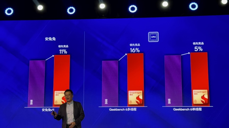 另外,與競品相比,第五代驍龍8安兔兔分數(shù)領(lǐng)先11%,Geekbench 6多線程分數(shù)領(lǐng)先16%,單線程分數(shù)也領(lǐng)先競品5%。在CPU多線程能效的部分,第五代驍龍8和競品相比,達到相同峰值性能的情況下,功耗領(lǐng)先36%;而在功耗相同的情況下,性能領(lǐng)先12%。