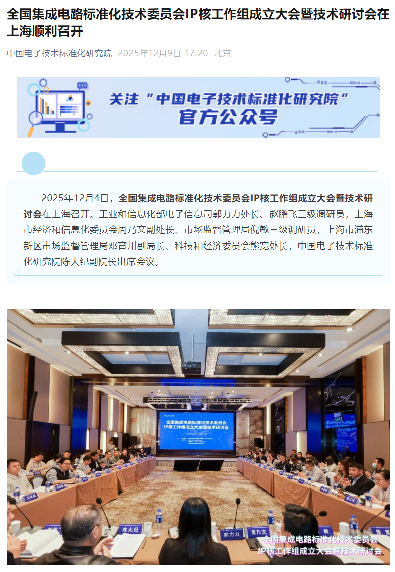 12 月 9 日消息,據(jù)中國電子技術(shù)標準化研究院今日消息,2025 年 12 月 4 日,全國集成電路標準化技術(shù)委員會 IP 核工作組成立大會暨技術(shù)研討會在上海召開。