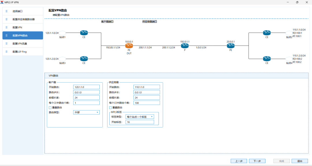 Step-5.設(shè)置PE側(cè)每VPN通告100條私網(wǎng)路由,即可完成向?qū)В?/P>