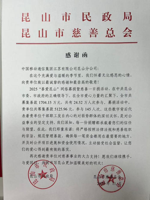 近日,中國(guó)移動(dòng)江蘇公司蘇州昆山分公司收到昆山市民政局、昆山市慈善總會(huì)發(fā)來(lái)的感謝函與慈善捐贈(zèng)證書,對(duì)其在2025年“善愛昆山”網(wǎng)絡(luò)募捐活動(dòng)中的積極貢獻(xiàn)予以高度認(rèn)可和誠(chéng)摯感謝。這一榮譽(yù)不僅是對(duì)昆山分公司員工愛心的褒獎(jiǎng),更是對(duì)蘇州移動(dòng)長(zhǎng)期以來(lái)積極履行社會(huì)責(zé)任、投身公益事業(yè)企業(yè)形象的生動(dòng)印證。
