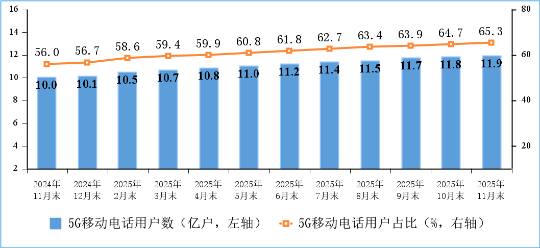 5G用戶規(guī)模持續(xù)擴(kuò)大。截至11月末,三家基礎(chǔ)電信企業(yè)及中國廣電的移動電話用戶總數(shù)達(dá)18.28億戶,比上年末凈增3854萬戶。其中,5G移動電話用戶達(dá)11.93億戶,比上年末凈增1.79億戶,占移動電話用戶的65.3%。