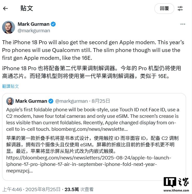 彭博社記者古爾曼昨天在 X 平臺(tái)透露,蘋果 iPhone18 Pro 將配備蘋果自研的第二代基帶。