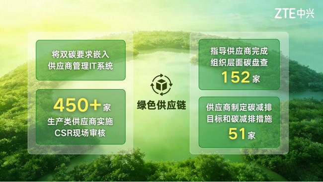 在綠色供應(yīng)鏈方面,中興通訊將雙碳要求嵌入供應(yīng)商協(xié)議簽署、現(xiàn)場審核、績效考核等供應(yīng)商管理IT系統(tǒng),目前已對450多家生產(chǎn)類供應(yīng)商實(shí)施了CSR現(xiàn)場審核,指導(dǎo)了152家供應(yīng)商完成組織層面碳盤查,51家供應(yīng)商制定碳減排目標(biāo)和碳減排措施。
