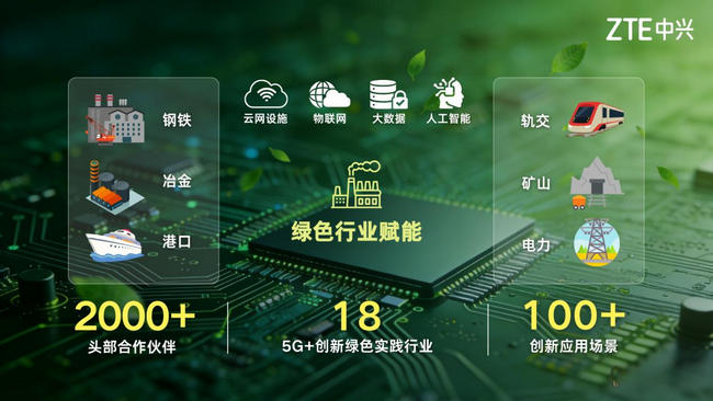在綠色行業(yè)賦能方面,中興通訊通過云網(wǎng)設(shè)施、物聯(lián)網(wǎng)、大數(shù)據(jù)、人工智能等一系列先進(jìn)技術(shù)與傳統(tǒng)產(chǎn)業(yè)結(jié)合,實(shí)現(xiàn)發(fā)展與減排的雙贏,已攜手2000+個行業(yè)頭部合作伙伴在鋼鐵、冶金、電子制造、港口、軌交、礦山、電力等18個行業(yè)廣泛開展5G+創(chuàng)新綠色實(shí)踐,打造了100多個創(chuàng)新應(yīng)用場景。