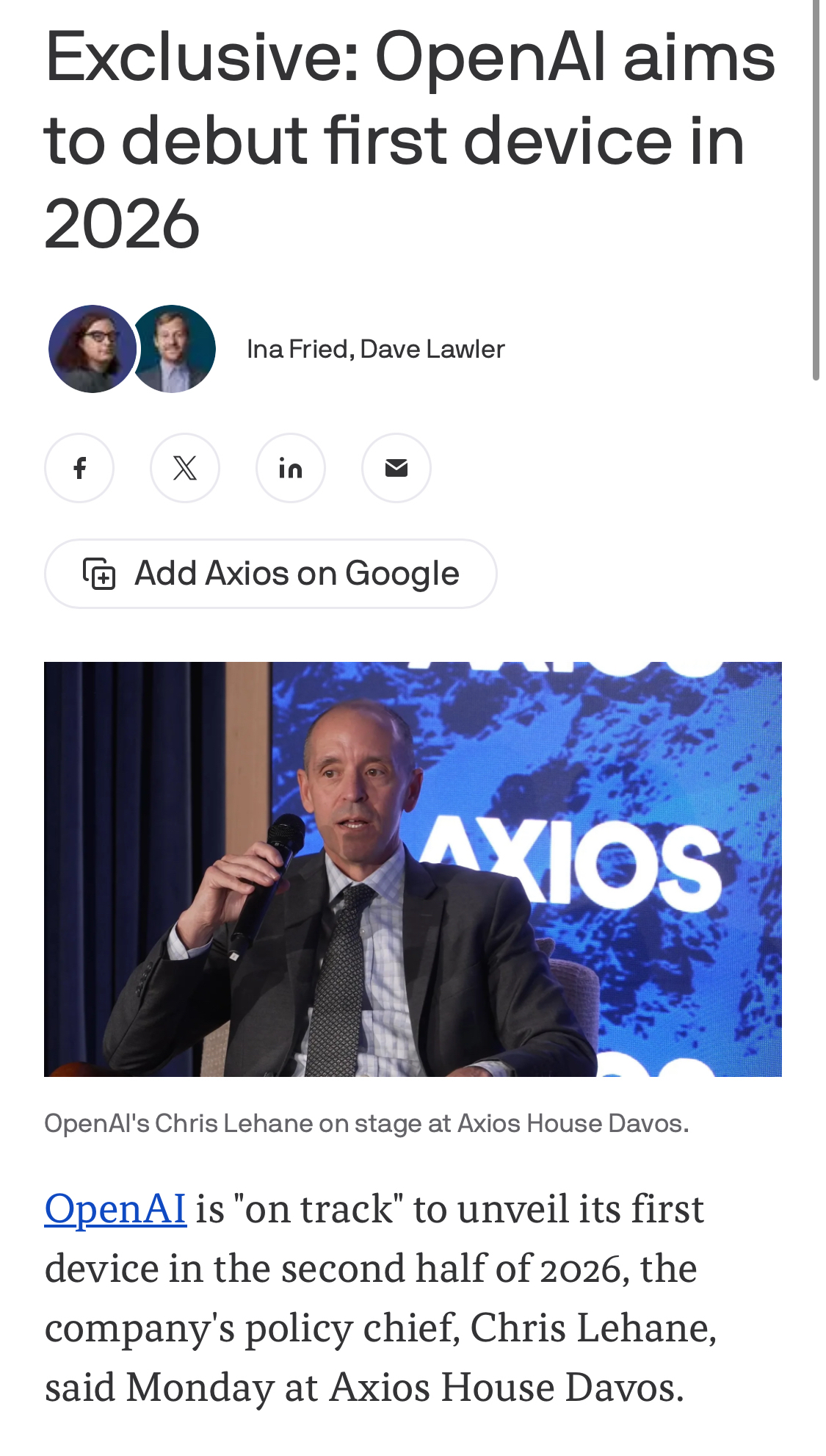 據(jù) Axios 網(wǎng)站報(bào)道,OpenAI 政策主管克里斯 · 萊恩周一在達(dá)沃斯論壇透露,公司“正按計(jì)劃”于 2026 年下半年推出其首款設(shè)備。