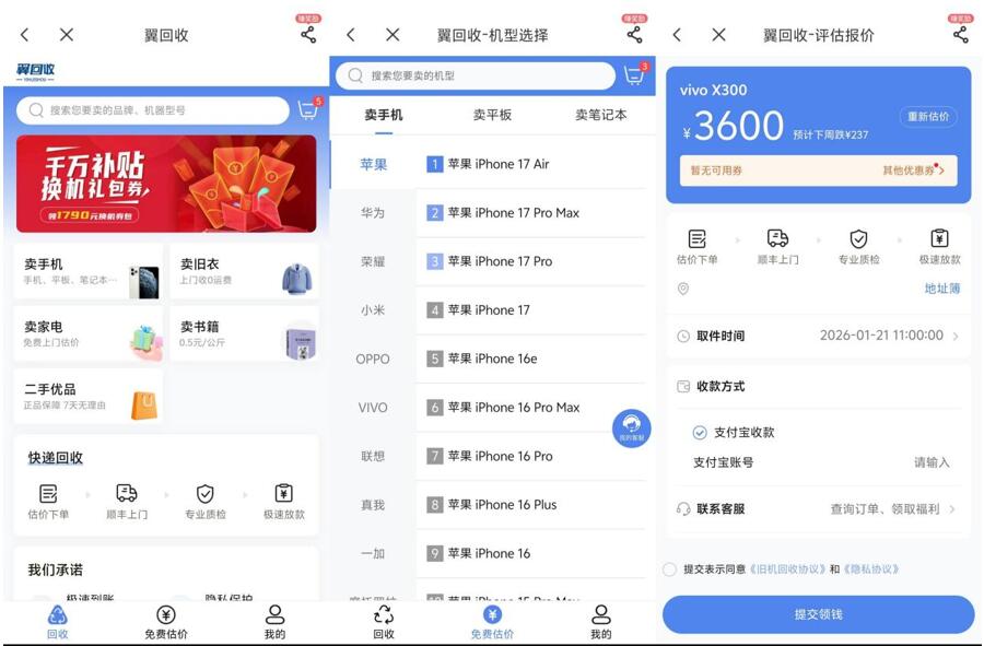 在電信APP“我的-低碳生活”里找到翼回收,選好舊手機(jī)的機(jī)型和使用情況,立刻就能看到評(píng)估報(bào)價(jià),明碼標(biāo)價(jià)沒(méi)有隱形套路。下單后,順豐當(dāng)天就上門(mén)取件,收貨后不到48小時(shí)就完成了質(zhì)檢放款。