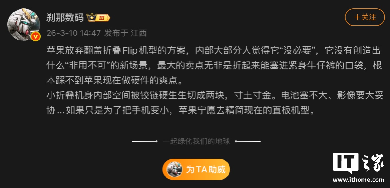 3 月 11 日消息,博主 @剎那數(shù)碼發(fā)文,透露蘋(píng)果放棄了翻蓋小折疊 Flip 機(jī)型的方案,這是因?yàn)閮?nèi)部大部分人覺(jué)得它“沒(méi)必要”,它沒(méi)有創(chuàng)造出什么“非用不可”的新場(chǎng)景,最大的賣點(diǎn)無(wú)非是折起來(lái)能塞進(jìn)緊身牛仔褲的口袋,“根本踩不到蘋(píng)果現(xiàn)在做硬件的爽點(diǎn)”。