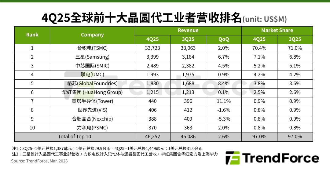 而在 2025Q4,這十大巨頭相關(guān)業(yè)務(wù)累計(jì)營(yíng)收達(dá) 462.52 億美元,環(huán)比增長(zhǎng) 2.6%。值得注意的是,高塔半導(dǎo)體 Tower Semiconductor 當(dāng)季度憑借硅光子、SiGe 等服務(wù)器相關(guān)新型利基應(yīng)用出貨的穩(wěn)健增長(zhǎng),市占排名前進(jìn)至第七;另一方面,三星晶圓代工也正式轉(zhuǎn)虧為盈。