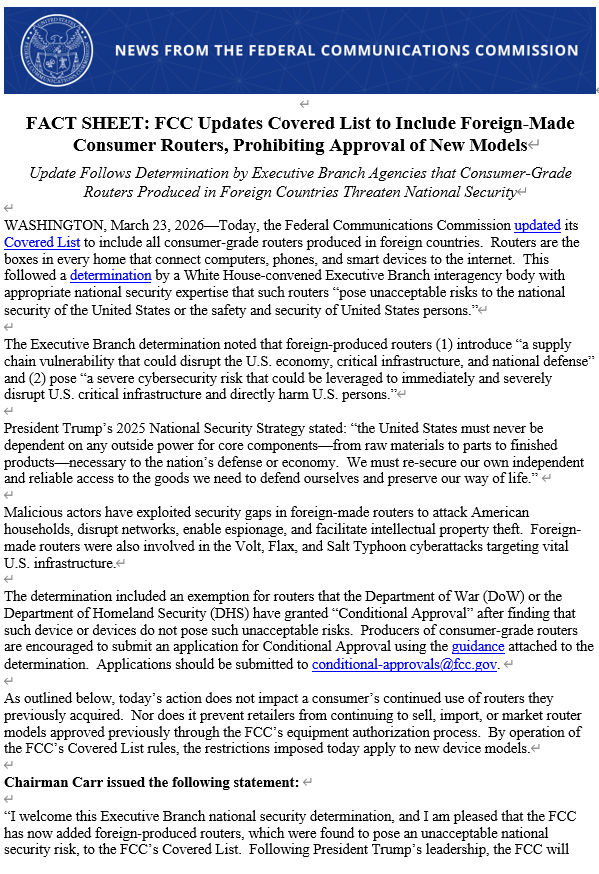 3 月 24 日消息,當(dāng)?shù)貢r(shí)間周一,美國聯(lián)邦通信委員會(huì)(FCC)以安全擔(dān)憂為由,宣布將禁止進(jìn)口所有新款外國制造的消費(fèi)級(jí)路由器。