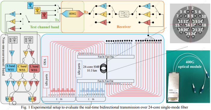 實驗系統(tǒng)整體采用“多波段光源+商用一體化相干光模塊+多芯光纖傳輸”的架構(gòu),實現(xiàn)超大容量實時雙向傳輸。