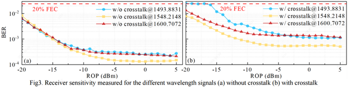 全部WDM信道的誤碼率(BER)均低于20%軟判決前向糾錯(SD-FEC)門限(2.4×10-2),驗證了系統(tǒng)在大規(guī)模并行傳輸場景下的可靠運行能力。