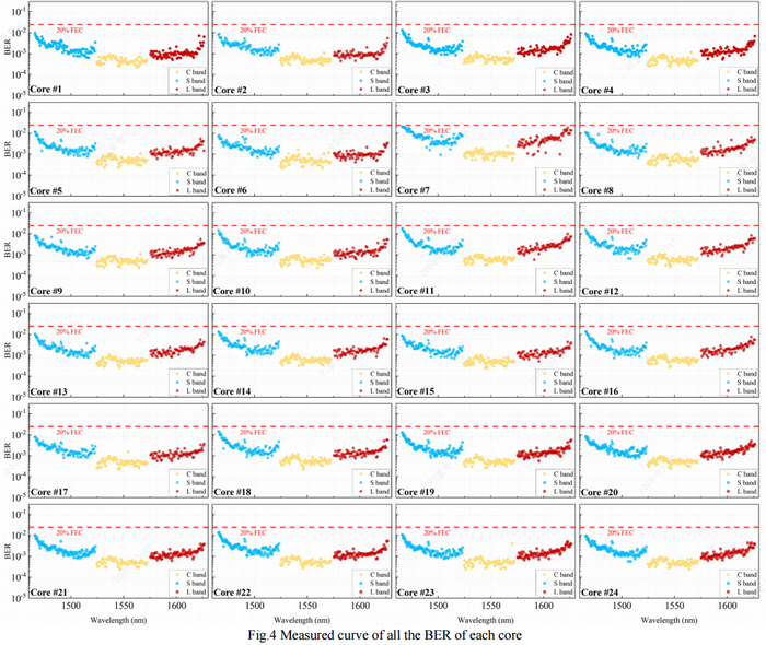 本研究首次在10.3km的24芯單模光纖上,實現(xiàn)了2.5Pb/s實時雙向傳輸容量。系統(tǒng)覆蓋S+C+L三波段,總光譜帶寬達19.65THz,通過262個WDM信道與24個纖芯信道的聯(lián)合復(fù)用,構(gòu)建了6288個并行傳輸通道,驗證了超大規(guī)?臻g-波長聯(lián)合擴展能力。
