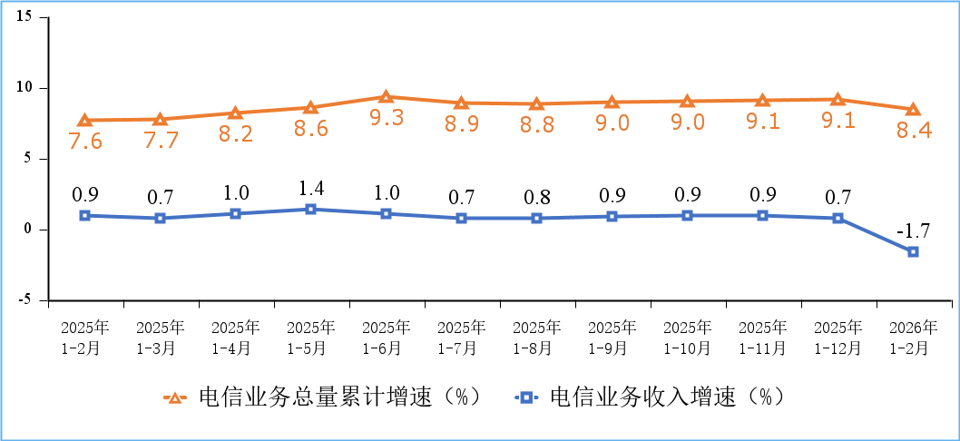 工信部:2026年1-2月電信業(yè)務(wù)總量同比增長(zhǎng)8.4%