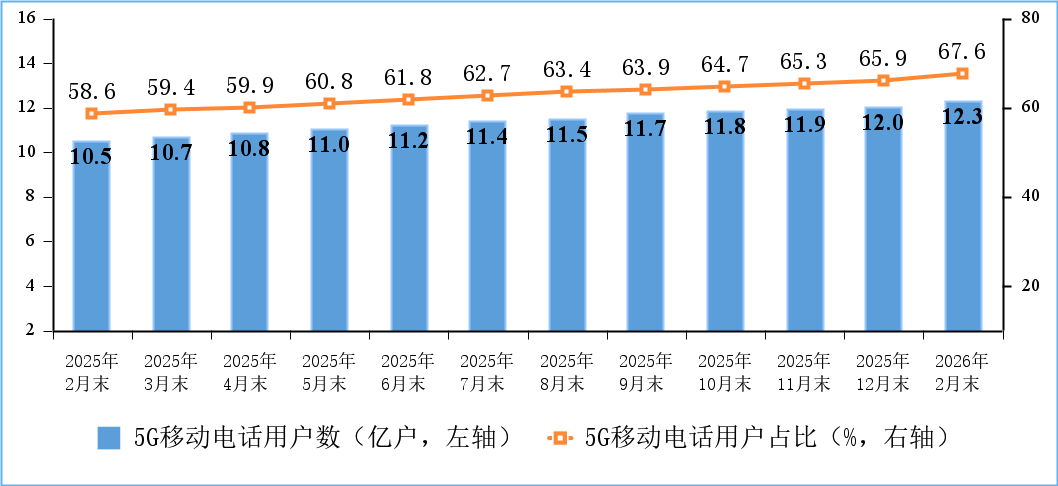 5G用戶數(shù)持續(xù)增加。截至2月末,三家基礎(chǔ)電信企業(yè)及中國(guó)廣電的移動(dòng)電話用戶總數(shù)達(dá)18.26億戶,比上年末減少100.1萬(wàn)戶。其中,5G移動(dòng)電話用戶達(dá)12.35億戶,比上年末凈增3044萬(wàn)戶,占移動(dòng)電話用戶的67.6%。