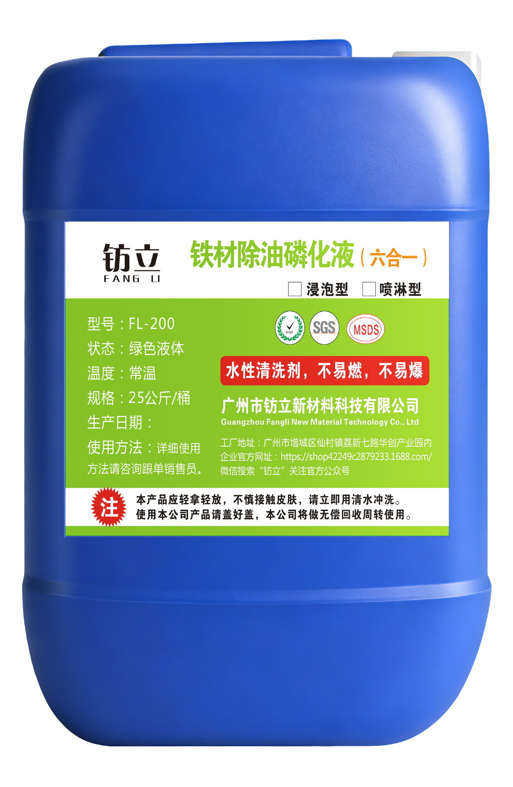 鈁立FL-200鐵材除油磷化液是公司核心產(chǎn)品,定位四合一一步式金屬前處理清洗方案,可單槽同步完成除油、除微銹、磷化、鈍化四大工序,無需多槽分步操作,適配浸泡、噴淋、手工擦拭多種使用場(chǎng)景。產(chǎn)品采用常溫水性配方,不含亞硝酸鹽、鉻酸鹽等有害物質(zhì),免水洗、可循環(huán)使用,能幫助企業(yè)簡(jiǎn)化生產(chǎn)流程、降低綜合成本,同時(shí)提升工件涂層附著力與耐鹽霧性能,裸膜防銹可達(dá)1-6個(gè)月,是傳統(tǒng)磷化工藝升級(jí)的優(yōu)選方案。