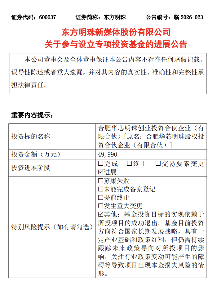 今日,東方明珠發(fā)布公告,披露其參與設立的專項投資基金——合肥華芯明珠創(chuàng)業(yè)投資合伙企業(yè)(有限合伙)(原名:合肥華芯明珠股權投資合伙企業(yè))的最新進展。