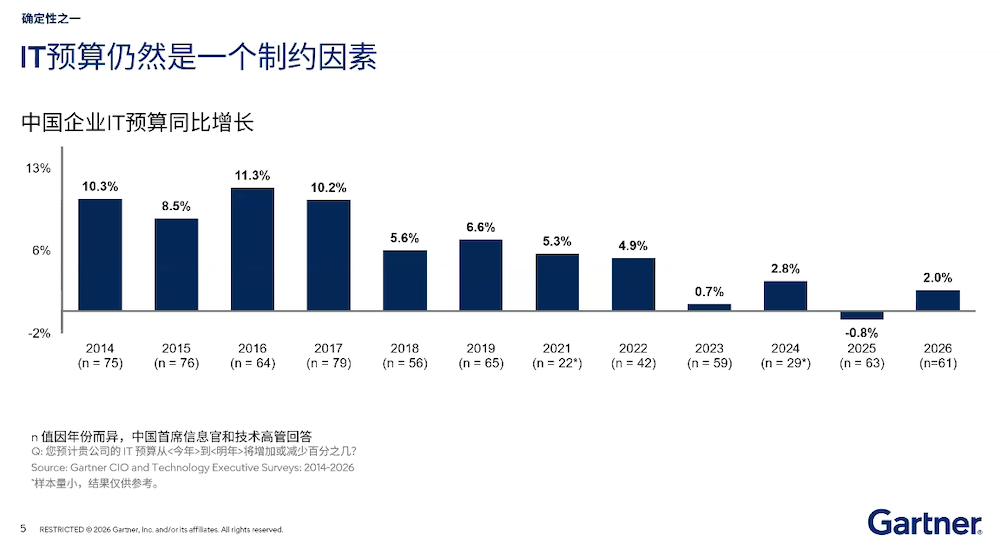 飛象原創(chuàng)(魏德齡/文)“砍預(yù)算了!边@可能是近年來(lái),經(jīng)常聽(tīng)到的一話。Gartner的數(shù)據(jù)也印證了這點(diǎn),自2014年開(kāi)始,中國(guó)企業(yè)的IT預(yù)算占比基本維持在10%左右,但在2018年開(kāi)始逐步下跌,2025年甚至達(dá)到最低點(diǎn)-0.8%,今年來(lái)到2%。