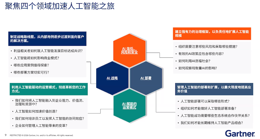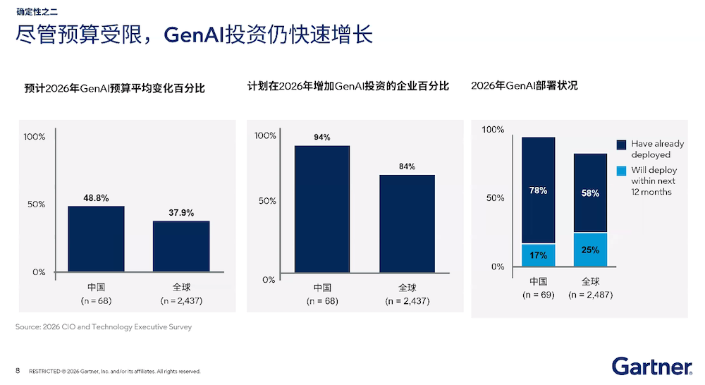 與IT預(yù)算縮減相對(duì)應(yīng)的正是生成式AI投資預(yù)算的增加,在中國(guó)預(yù)計(jì)今年GenAI的預(yù)算會(huì)增加48.8%,高于全球的37.9%。據(jù)陳勇介紹,在Gartner的調(diào)研中,有94%的企業(yè)說(shuō):“我會(huì)在這方面增加投入”,全球是84%。在2026年已經(jīng)部署GenAI的已經(jīng)有78%,而全球平均只有58%。