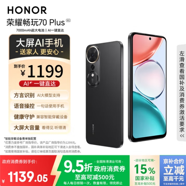 京東大屏AI手機榮耀暢玩70 Plus是京東聯(lián)合榮耀,通過C2M反向定制模式,打造的首款大屏AI手機。手機側面配備了實體AI鍵,清理加速、調整亮度、掃一掃等常用功能一鍵搞定;可以用語音點外賣、買藥、買菜,手機會自動跳轉到京東APP完成搜索,消費者可以直接下單。AI語音還可識別方言,即使不太會說普通話,也能用AI語音方式完成操作。這款手機京東11.11享政企雙補至高直降60元,到手至低1139元,還享3期免息補貼,送家人更安心。