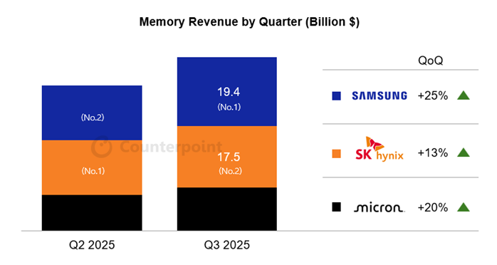 Counterpoint:三星電子可望在 2025Q3 重奪全球最大存儲廠商地位