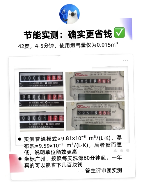在測試相同出水溫度(40℃)下熱水器的單位能耗時,多名答主采用燃氣表+流量計組合的專業(yè)測量方法,得出令人驚訝的結論:瀑布洗模式,盡管提供了更大的水流量,但其單位能效竟然優(yōu)于普通模式。