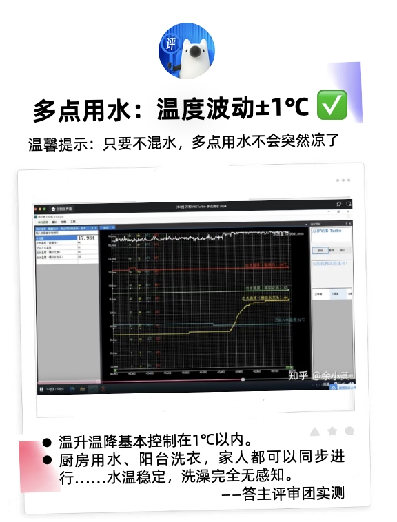 在多點用水測試中,評審團答主@王昊誠在家中進行了多水路并發(fā)測試,模擬了廚房和浴室同時用水的場景。結果顯示,萬和安睡洗V9S TURBO能夠確保在多個用水點同時開啟的狀態(tài)下,出水溫度浮動范圍始終控制在±0.5℃以內(nèi),遠優(yōu)于行業(yè)普遍 3~5℃ 的波動表現(xiàn)。這意味著,即便有人在浴室洗澡,也可以正常在廚房用熱水洗碗,同時在陽臺開水洗衣服,一家人可同時安心用水。