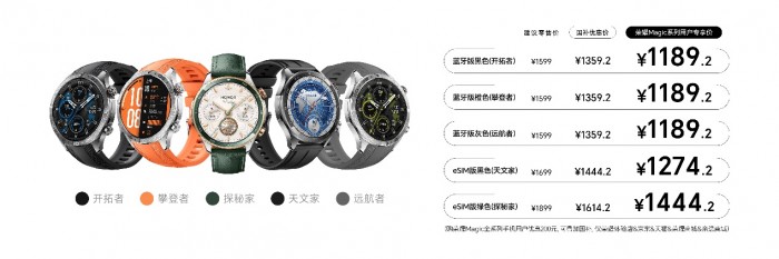 目前,榮耀手表5 Pro已開(kāi)啟首銷(xiāo),共有藍(lán)牙和eSIM兩個(gè)版本可選,其中藍(lán)牙版本,攀登者(橙色)、開(kāi)拓者(黑色)、遠(yuǎn)航者(灰色)首銷(xiāo)國(guó)補(bǔ)優(yōu)惠價(jià)1359.2元;eSIM版本,天文家(黑色)首銷(xiāo)國(guó)補(bǔ)優(yōu)惠價(jià)1444.2元,探秘家(綠色)首銷(xiāo)國(guó)補(bǔ)優(yōu)惠價(jià)1614.2元。首銷(xiāo)期榮耀Magic系列用戶(hù),攀登者、開(kāi)拓者、遠(yuǎn)航者專(zhuān)享國(guó)補(bǔ)優(yōu)惠價(jià)1189.2元,天文家專(zhuān)享國(guó)補(bǔ)優(yōu)惠價(jià)1274.2元,探秘家專(zhuān)享國(guó)補(bǔ)優(yōu)惠價(jià)1444.2元。