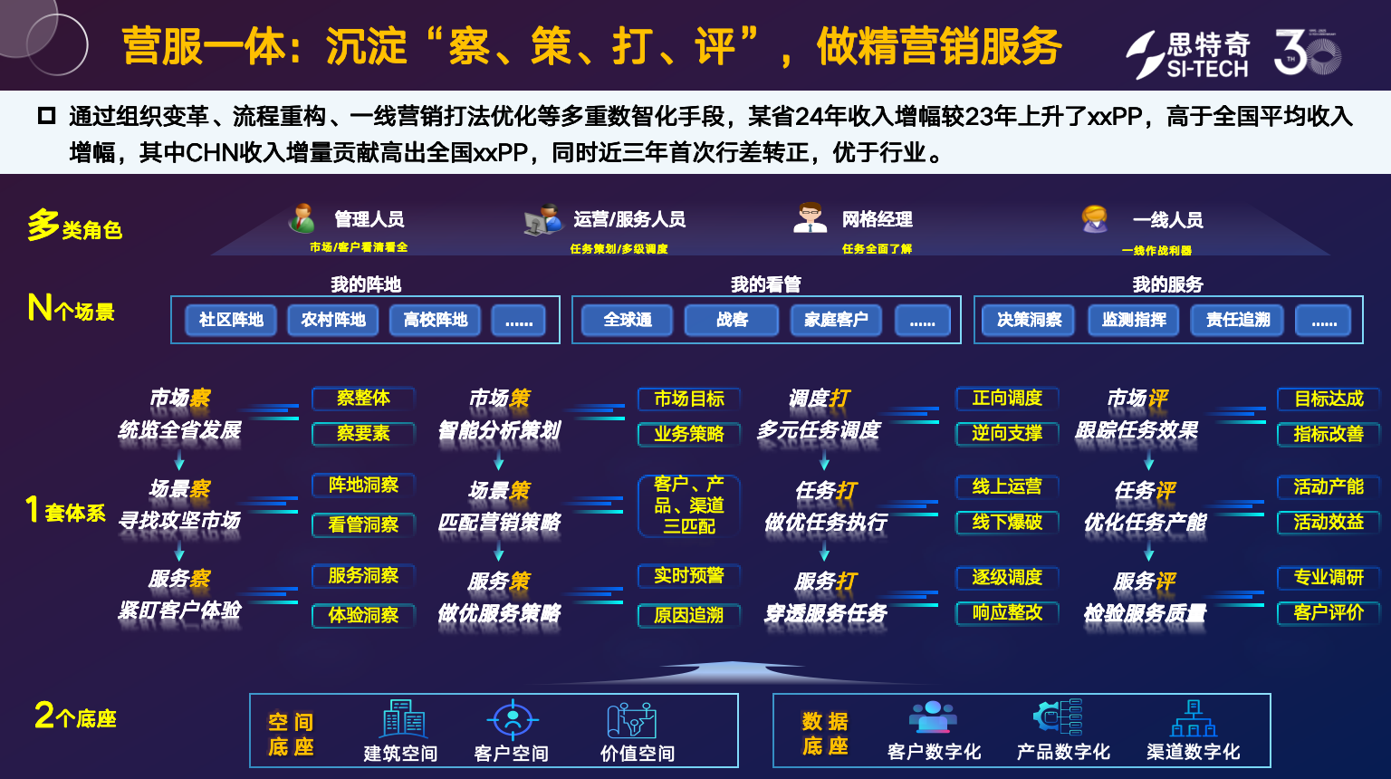 針對運營商大市場運營的核心痛點,思特奇"市場全息作戰(zhàn)"方案以"存增一體、營服一體"為戰(zhàn)略目標,構建全鏈路指揮作戰(zhàn)體系,沉淀"察、策、打、評"四大核心能力,徹底激活市場數智化轉型動能。該體系通過組織架構革新打破部門壁壘、流程重構優(yōu)化業(yè)務鏈路、一線打法升級提升執(zhí)行效能,形成"數據驅動決策、智能賦能執(zhí)行"的閉環(huán)運營模式。