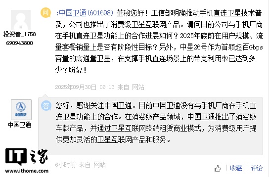 10 月 17 日消息,中國衛(wèi)通今日在投資者互動(dòng)平臺(tái)透露,目前中國衛(wèi)通沒有與手機(jī)廠商在手機(jī)直連衛(wèi)星功能上的合作。在消費(fèi)級(jí)產(chǎn)品領(lǐng)域,中國衛(wèi)通推出了消費(fèi)級(jí)車載產(chǎn)品,并通過衛(wèi)星互聯(lián)網(wǎng)終端租賃商業(yè)模式,為消費(fèi)級(jí)用戶提供更加靈活的衛(wèi)星互聯(lián)網(wǎng)產(chǎn)品和服務(wù)。
