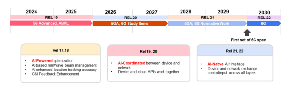 AI能力最早出現(xiàn)在3GPP Release 17版本中,并在Release 18中得到擴(kuò)展。未來的版本預(yù)計(jì)將從AI協(xié)同網(wǎng)絡(luò)(AI管理離散網(wǎng)絡(luò)功能)向AI原生架構(gòu)(AI深度嵌入整個網(wǎng)絡(luò)堆棧)過渡(圖1)。在6G時代,AI將滲透每一層,釋放前所未有的性能與自動化水平。盡管3GPP標(biāo)準(zhǔn)并未覆蓋所有層級,但創(chuàng)新正在貫穿整個網(wǎng)絡(luò)堆棧,部分供應(yīng)商和運(yùn)營商已開始在網(wǎng)絡(luò)中直接部署AI模型。