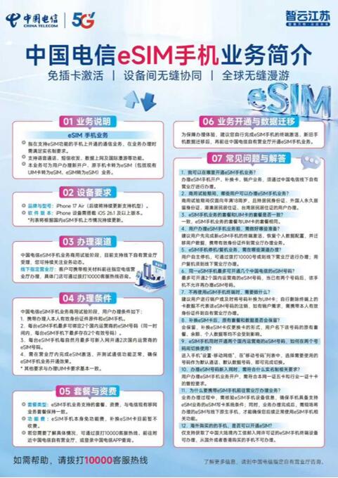 江蘇電信以eSIM手機(jī)業(yè)務(wù)的“無(wú)卡科技”賦能千萬(wàn)蘇城百姓的智慧生活,以建設(shè)“智云江蘇”的數(shù)字力量,為千萬(wàn)用戶的智慧生活注入通信新活力。告別傳統(tǒng)卡槽,惠享輕薄時(shí)尚!江蘇電信eSIM手機(jī)業(yè)務(wù)已全面就緒,即刻走進(jìn)身邊營(yíng)業(yè)廳,擁抱“無(wú)卡”自由,暢享數(shù)字新生活!