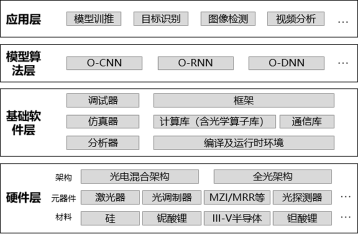 光計算技術(shù)架構(gòu)包括硬件層、基礎(chǔ)軟件層、模型算法層和應(yīng)用層,整體架構(gòu)和內(nèi)容仍在持續(xù)完善過程中。