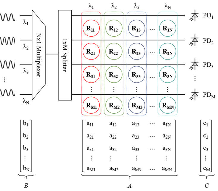 2.基于MRR陣列的矩陣向量乘法:將數(shù)學(xué)上的矩陣與微環(huán)陣列進(jìn)行同構(gòu)映射,依賴于波分復(fù)用(Wavelength Division Multiplexing, WDM)技術(shù),輸入向量中的每個元素對應(yīng)于一個具有特定頻率或波長的輸入光,然后通過M×N規(guī)模的光學(xué)權(quán)重矩陣陣列對其進(jìn)行不同的幅度調(diào)節(jié),從而實(shí)現(xiàn)對輸入信號的加權(quán)。