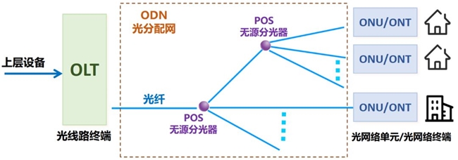 PON方案采用點對多點(P2MP)架構,說白了,就是把一束光復制為多束光,連接多個用戶(如32/64/128個)。