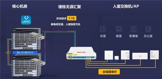 “1:16高密度彩光”,是指一個核心交換機的彩光端口,通過一根光纖和無源分光設備,即可同時接入16臺遠端的萬兆彩光接入交換機,實現(xiàn)1:16的超高收斂比。