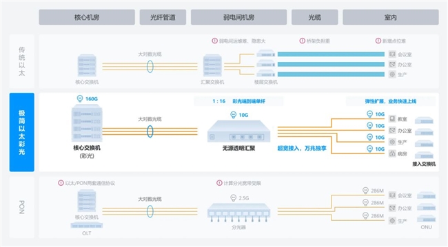 在維護性、擴展性、兼容性等各方面,以太彩光方案也比傳統(tǒng)以太網(wǎng)方案和PON方案更有優(yōu)勢。