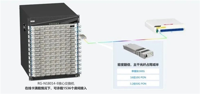 以銳捷RG-N18014-E核心交換機為例,在線卡滿載的情況下,一個設備就可以承載1536個房間的接入(設備有96個端口,每個端口16個接入,96×16=1536),足以滿足絕大部分學校、醫(yī)院、企業(yè)的需求。