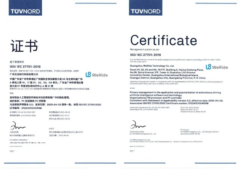 隱私保護(hù)添權(quán)威背書!“全球Robotaxi第一股”文遠(yuǎn)知行喜提ISO/IEC 27701認(rèn)證