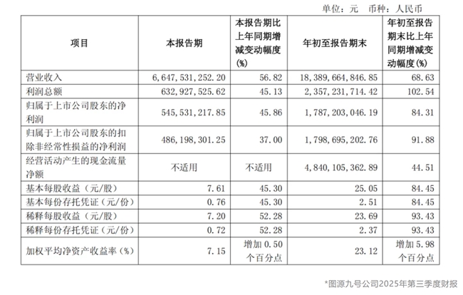 10月24日,九號(hào)公司2025年第三季度財(cái)報(bào)透露,九號(hào)公司單季營(yíng)收66.5億元,同比激增56.82%;歸母凈利潤(rùn)5.5億元,同比增長(zhǎng)45.86%;前三季度營(yíng)收約184億元,歸母凈利潤(rùn)約17.9億元。